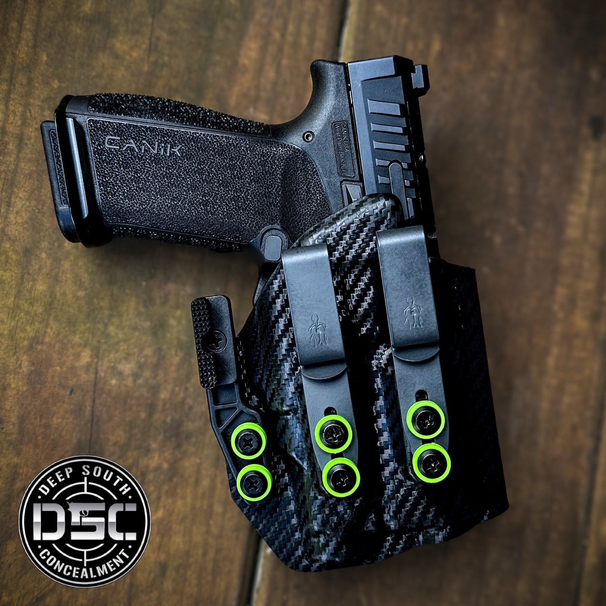 Black Add-Ons: Concealment Claw, Dual Discreet Carry Concepts HLR Clips, Neon Green Finishing Washers, and Appendix Concealment Wedge
