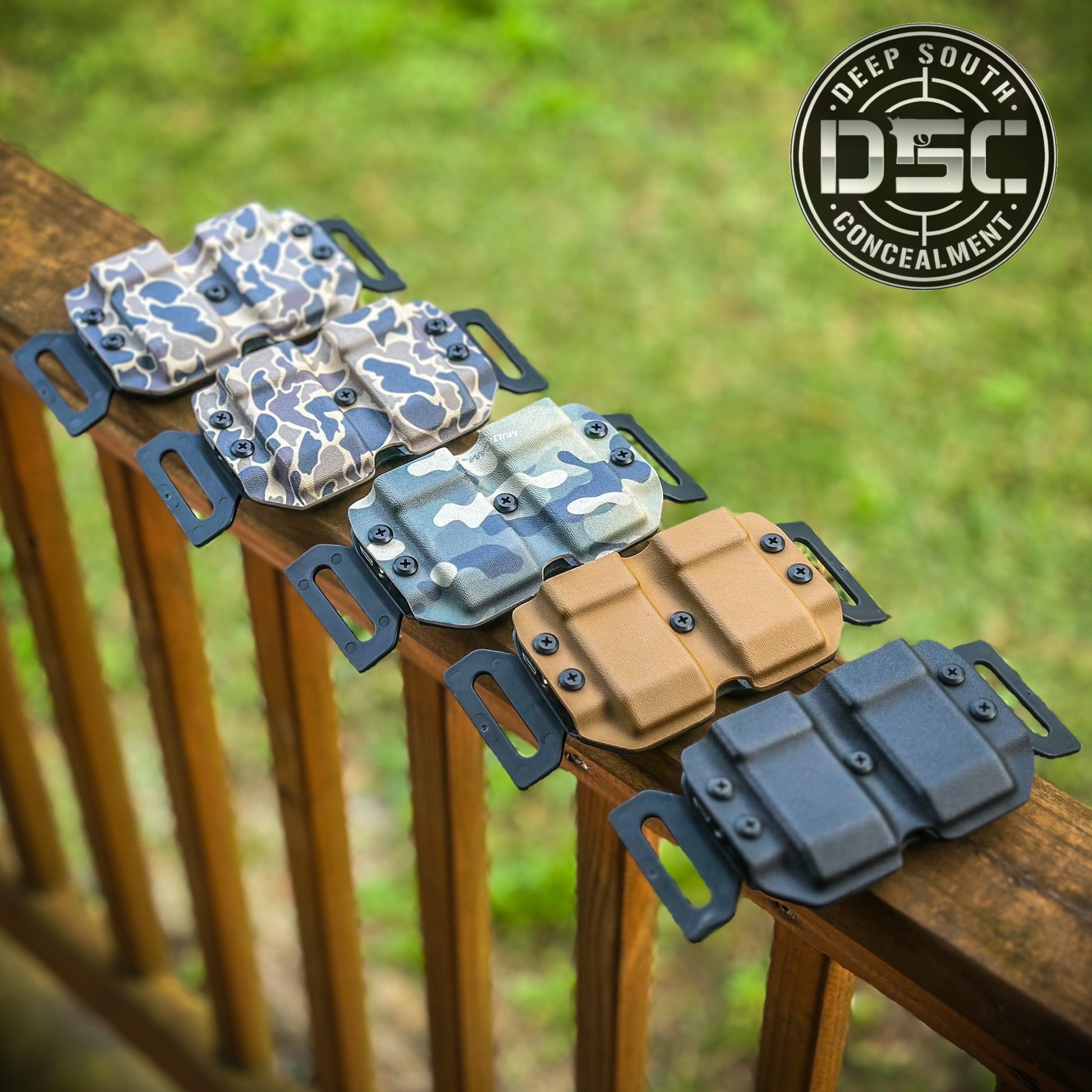 Our Double Stack 9mm/.40 dual magazine carriers are handcrafted from high quality .080 thick material for long lasting durability while maintaining comfort in a lightweight design. Each magazine carrier comes standard with MRD's (mag retention devices) that allows adjustment to user preference with a simple turn of a allen screw. If you need any help with your order or have questions, please feel free to contact us.