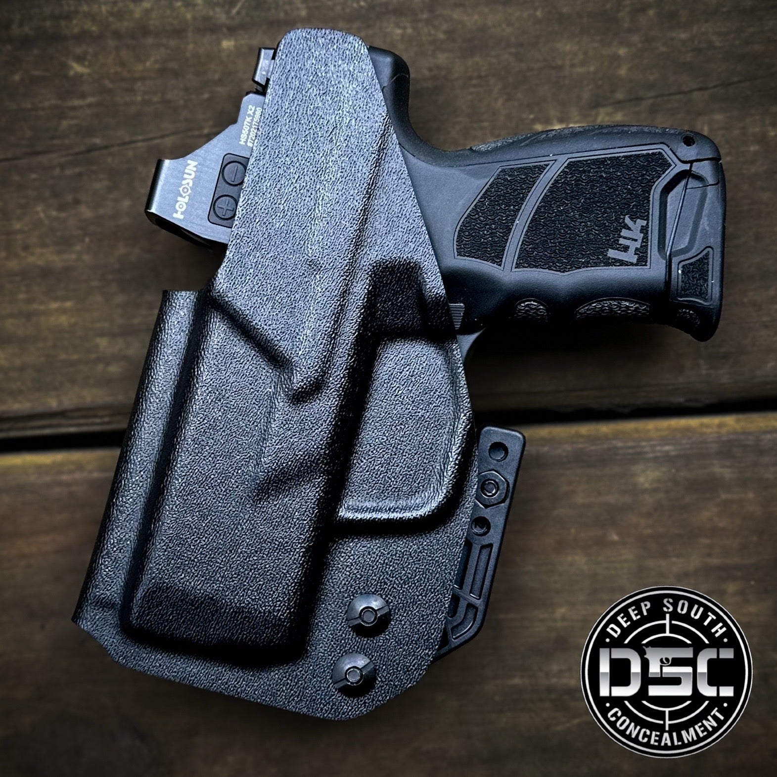 Our IWB holsters are handcrafted from high quality .080 thick material for long lasting durability while maintaining comfort and firearm protection in a lightweight design. Each holster comes standard with adjustable retention that allows adjustment to preference. If you need any help with your order or have questions, please feel free to contact us.