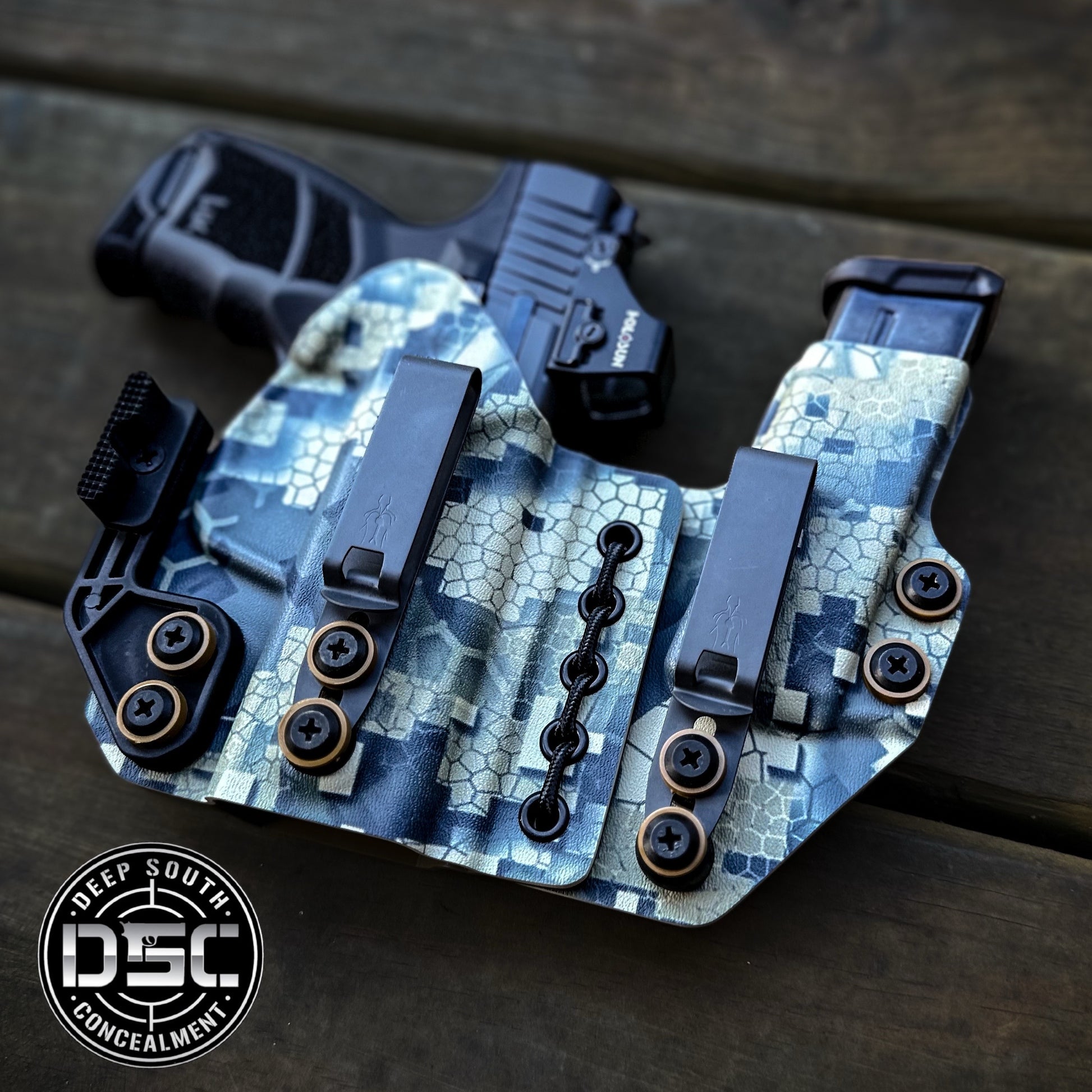 Our IWB holsters are handcrafted from high quality .080 thick material for long lasting durability while maintaining comfort and firearm protection in a lightweight design. Each holster comes standard with adjustable retention that allows adjustment to preference. The dual overhooks are height adjustable for deep carry to preference. The magazine side car is bound to the firearm half with military grade shock cord. Allowing the holster to flex and give with the carrier. If you need any help with your order or have questions, please feel free to contact us.