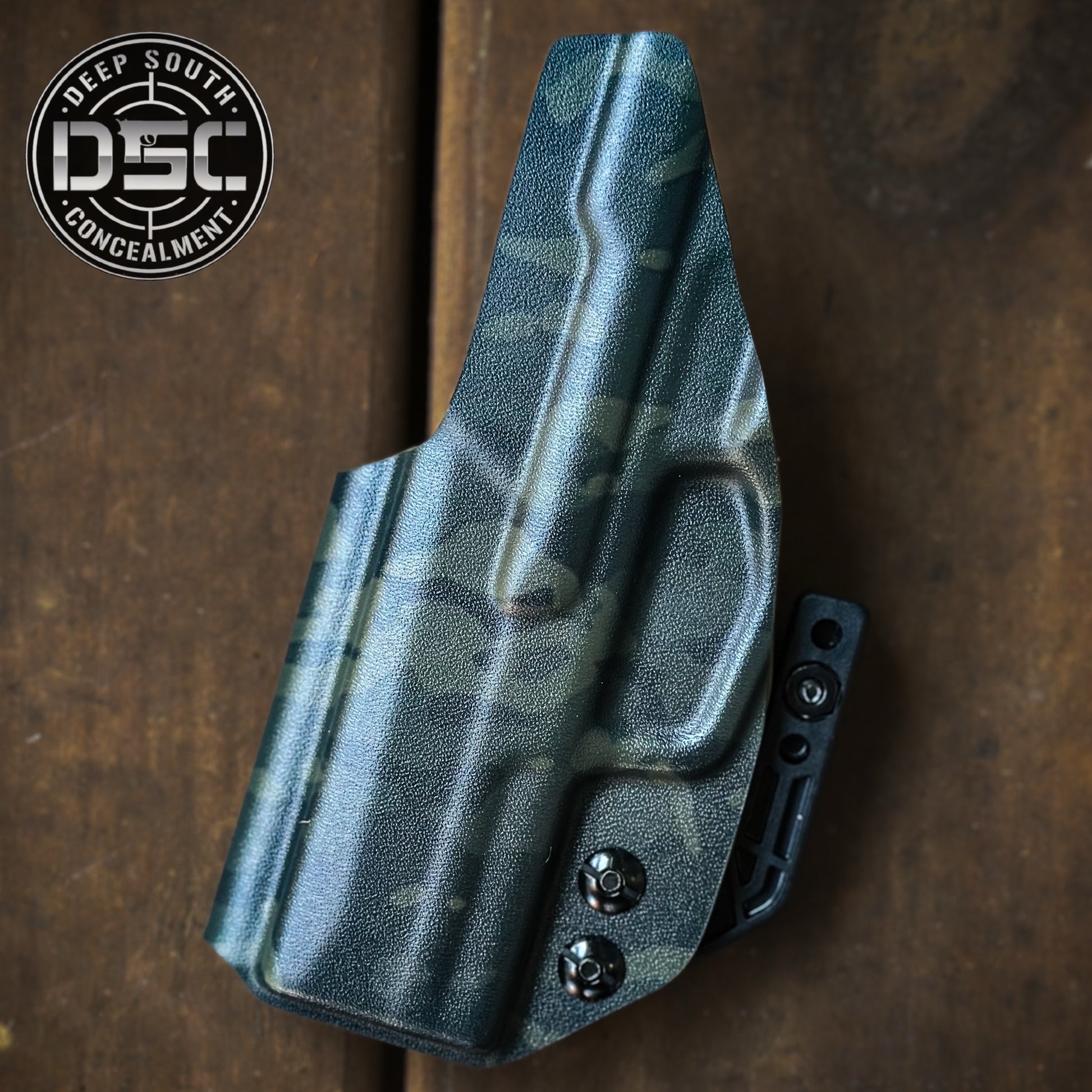 Our IWB holsters are handcrafted from high quality .080 thick material for long lasting durability while maintaining comfort and firearm protection in a lightweight design. Each holster comes standard with adjustable retention that allows adjustment to preference. If you need any help with your order or have questions, please feel free to contact us.