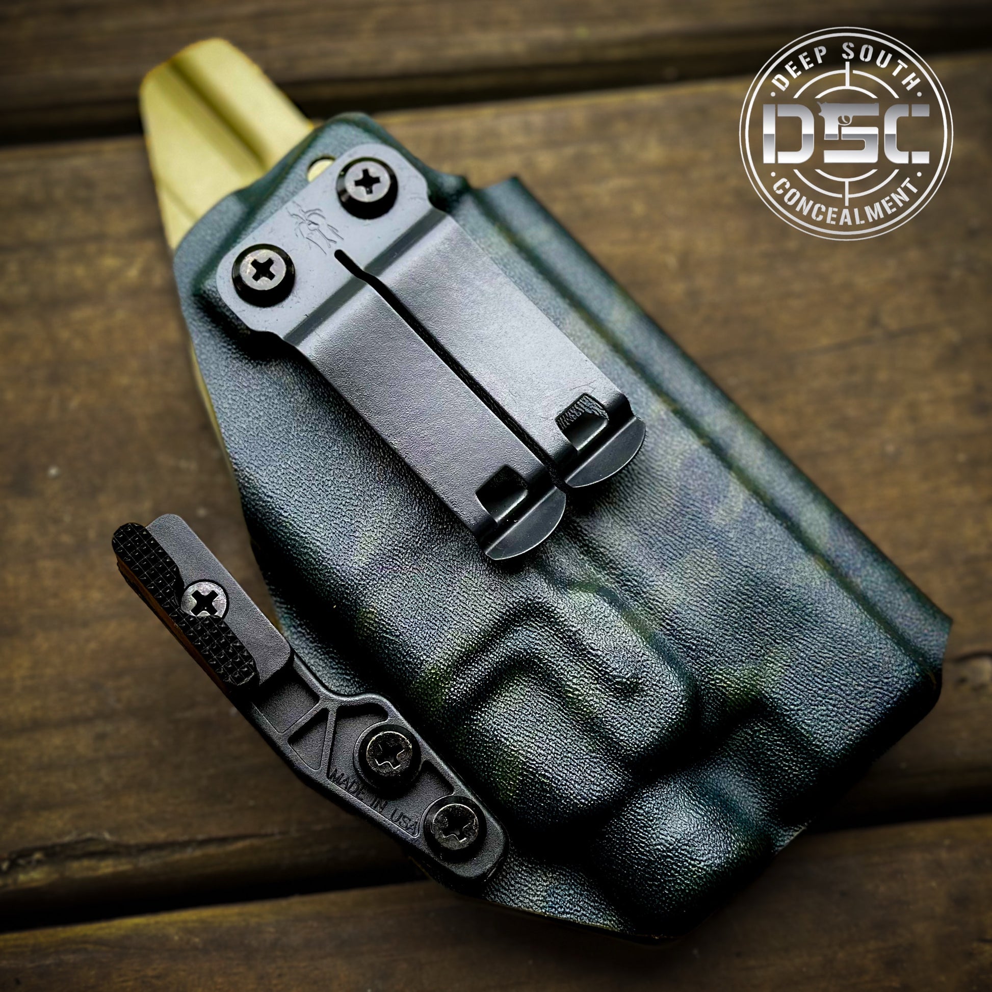 Our IWB holsters are handcrafted from high quality .080 thick material for long lasting durability while maintaining comfort and firearm protection in a lightweight design. Each holster comes standard with adjustable retention that allows adjustment to preference. If you need any help with your order or have questions, please feel free to contact us.