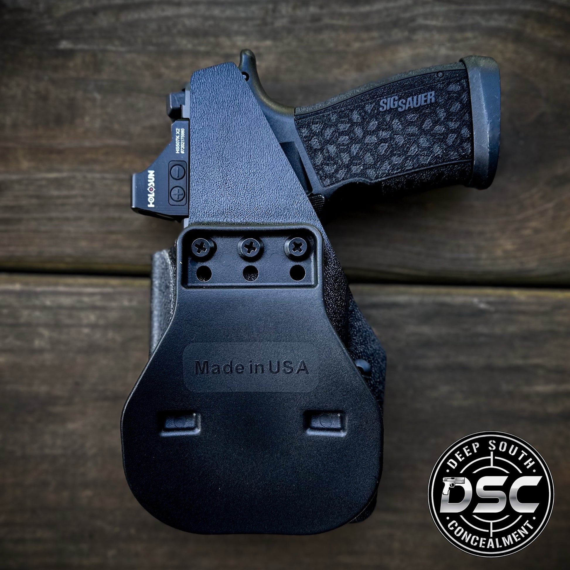 Our IWB holsters are handcrafted from high quality .080 thick material for long lasting durability while maintaining comfort and firearm protection in a lightweight design. Each holster comes standard with adjustable retention that allows adjustment to preference. If you need any help with your order or have questions, please feel free to contact us.