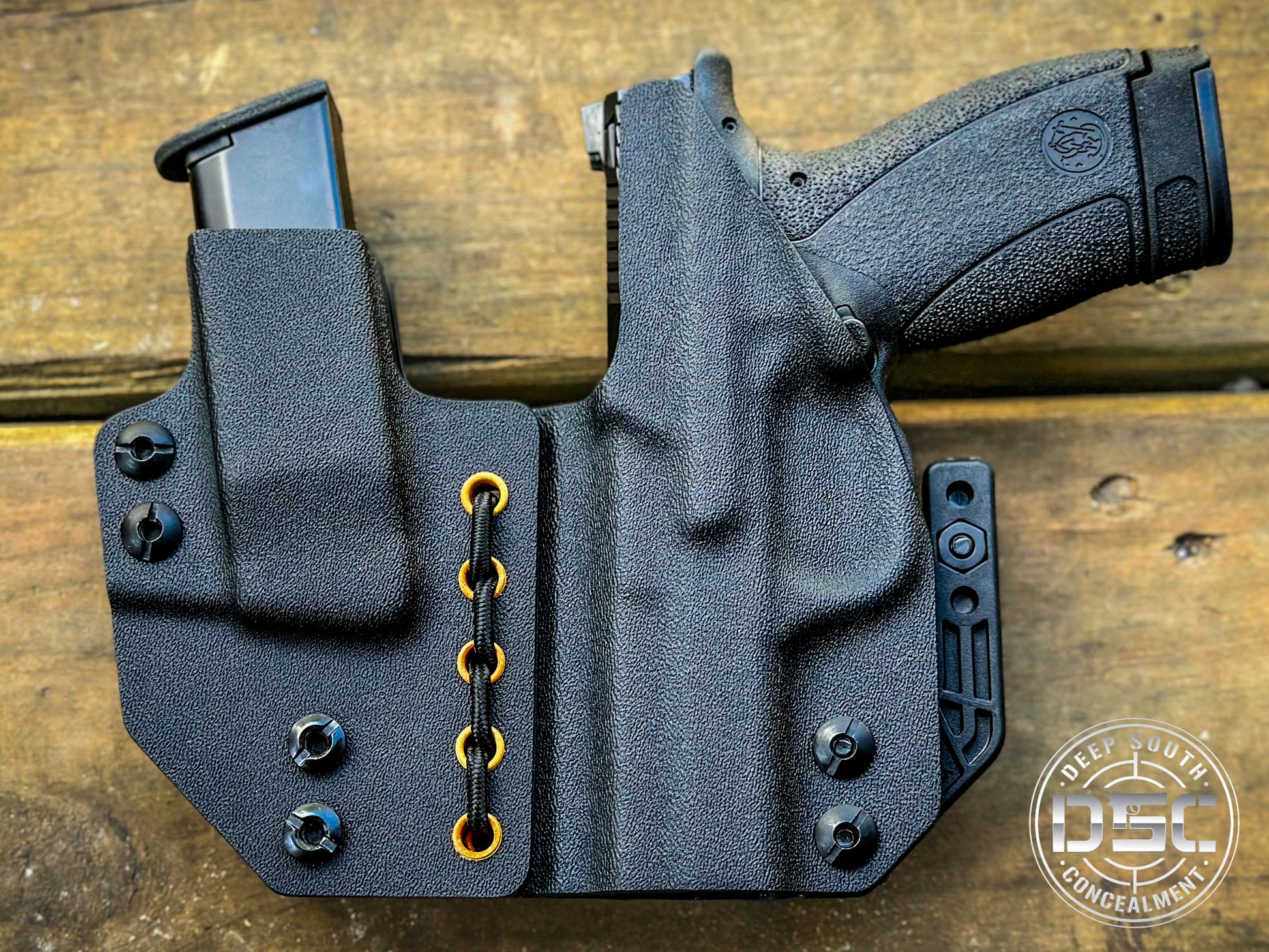 Our IWB holsters are handcrafted from high quality .080 thick material for long lasting durability while maintaining comfort and firearm protection in a lightweight design. Each holster comes standard with adjustable retention that allows adjustment to preference. The dual overhooks are height adjustable for deep carry to preference. The magazine side car is bound to the firearm half with military grade shock cord. Allowing the holster to flex and give with the carrier. If you need any help with your order or have questions, please feel free to contact us.