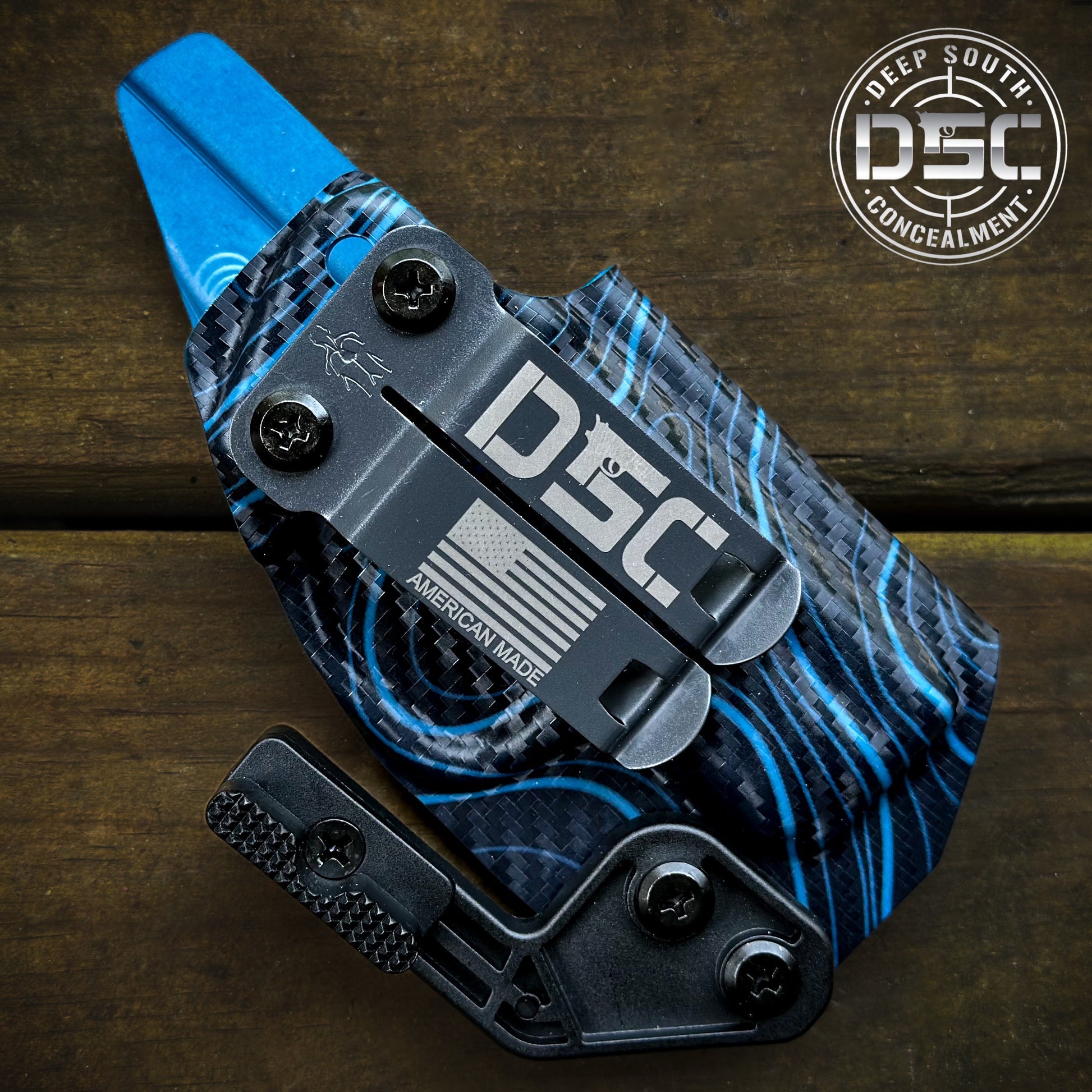 Our IWB holsters are handcrafted from high quality .080 thick material for long lasting durability while maintaining comfort and firearm protection in a lightweight design. Each holster comes standard with adjustable retention that allows adjustment to preference. If you need any help with your order or have questions, please feel free to contact us.