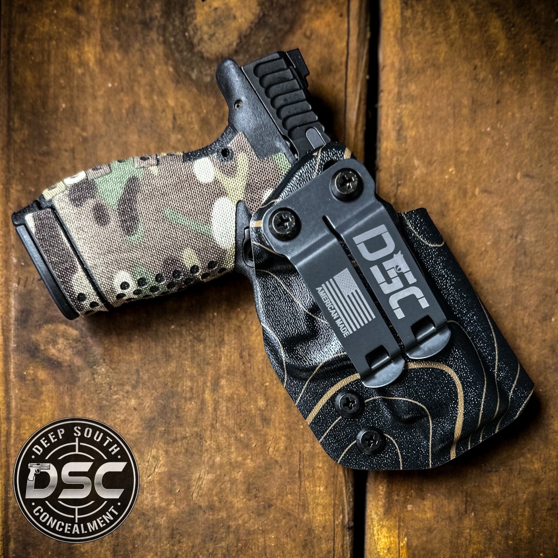 Our IWB holsters are handcrafted from high quality .080 thick material for long lasting durability while maintaining comfort and firearm protection in a lightweight design. Each holster comes standard with adjustable retention that allows adjustment to preference. If you need any help with your order or have questions, please feel free to contact us.