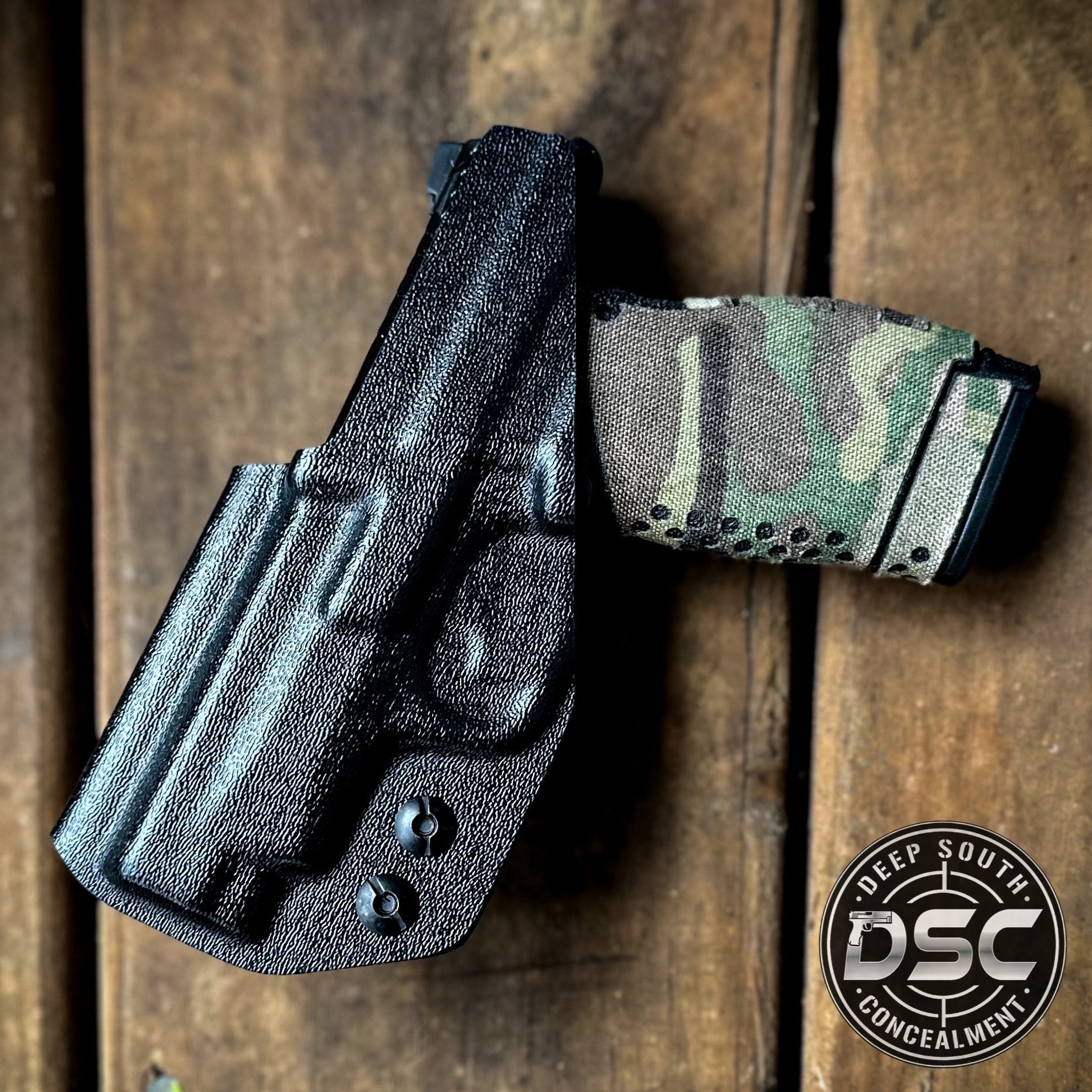 Our IWB holsters are handcrafted from high quality .080 thick material for long lasting durability while maintaining comfort and firearm protection in a lightweight design. Each holster comes standard with adjustable retention that allows adjustment to preference. If you need any help with your order or have questions, please feel free to contact us.
