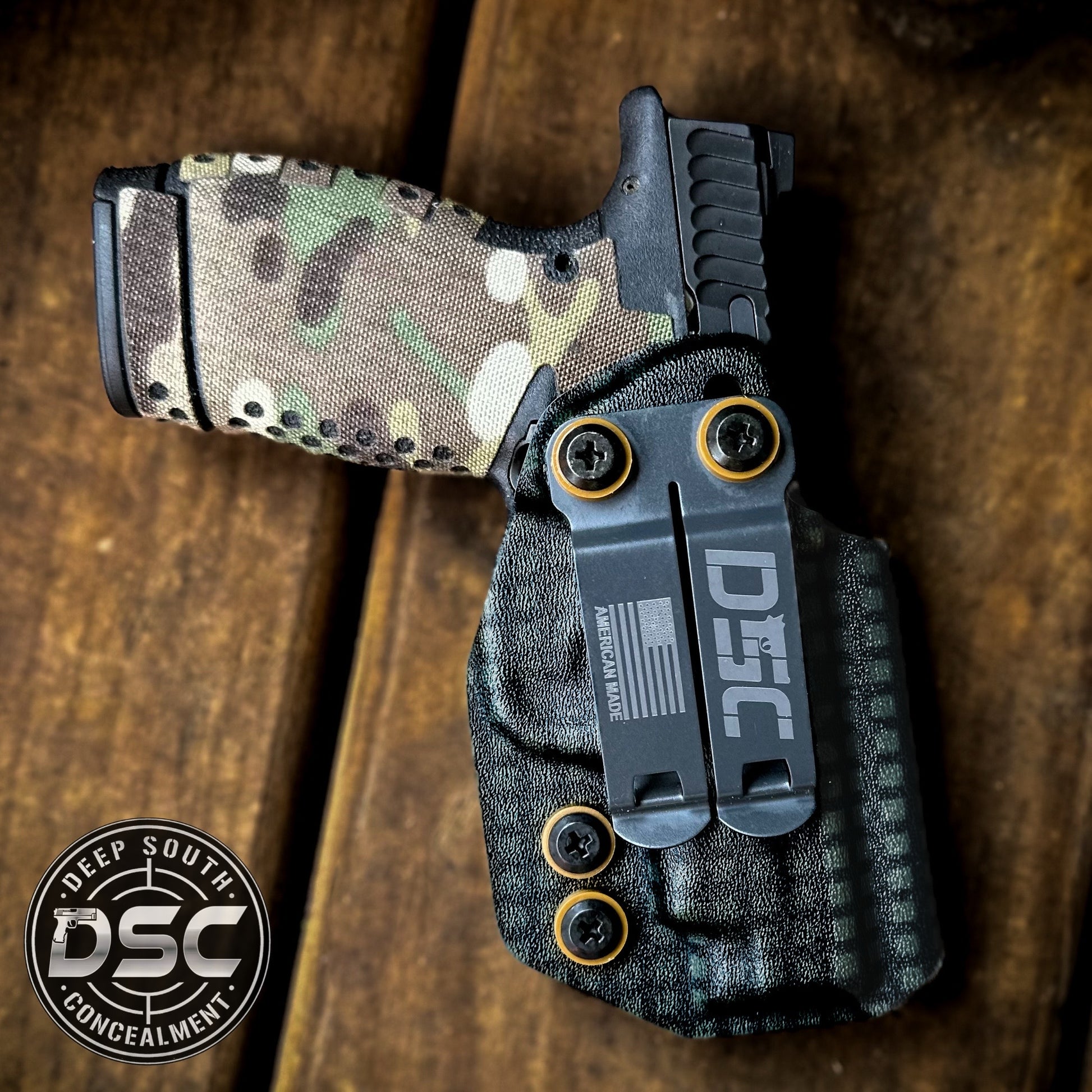Our IWB holsters are handcrafted from high quality .080 thick material for long lasting durability while maintaining comfort and firearm protection in a lightweight design. Each holster comes standard with adjustable retention that allows adjustment to preference. If you need any help with your order or have questions, please feel free to contact us.