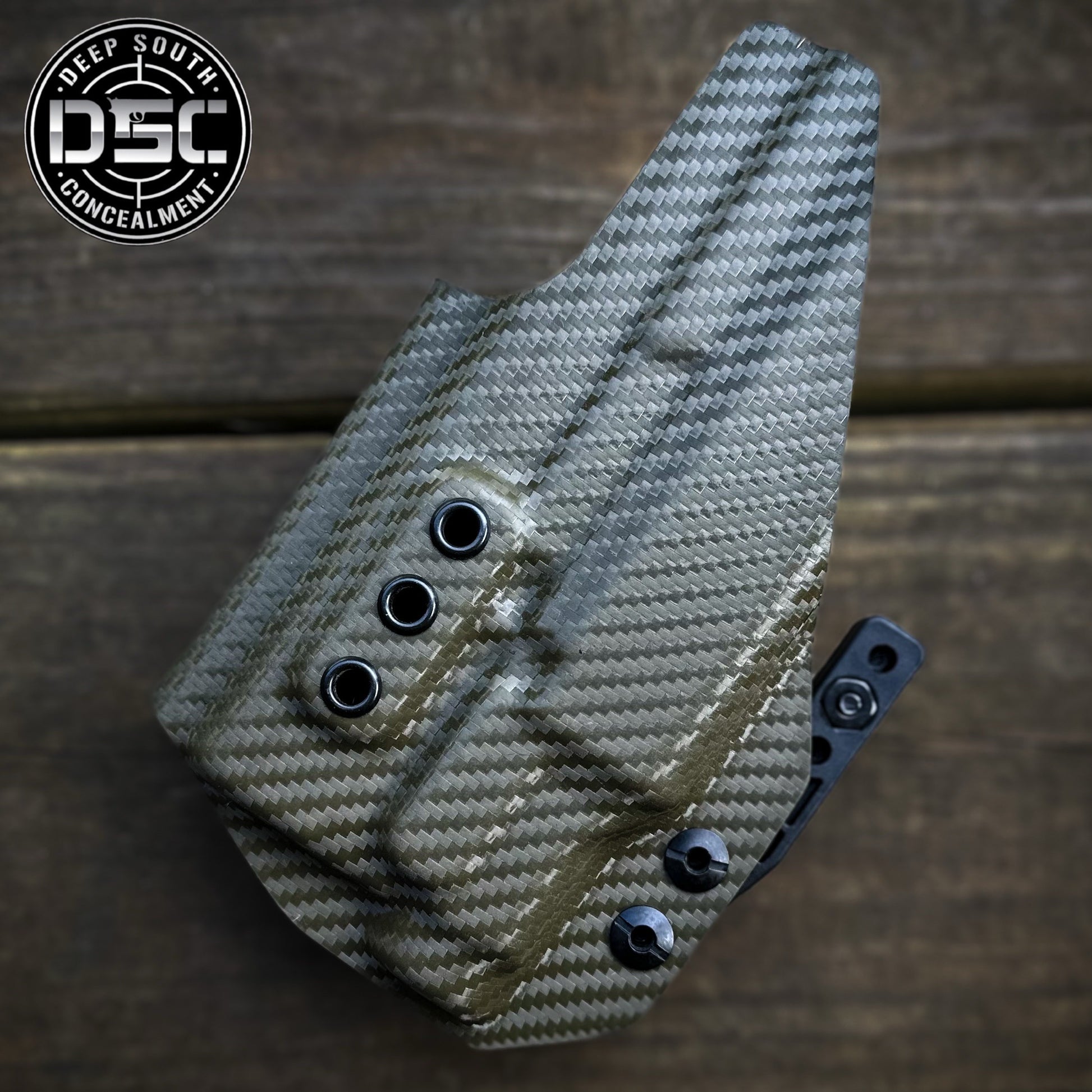 Our OWB holsters are handcrafted from high quality .080 thick material for long lasting durability while maintaining comfort and firearm protection in a lightweight design. Each holster comes standard with adjustable retention that allows adjustment to preference. If you need any help with your order or have questions, please feel free to contact us.